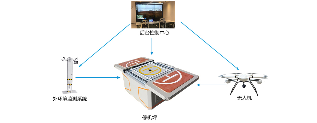 系統(tǒng)包括后臺(tái)控制中心、外環(huán)境監(jiān)測(cè)系統(tǒng)、停機(jī)坪、無(wú)人機(jī)