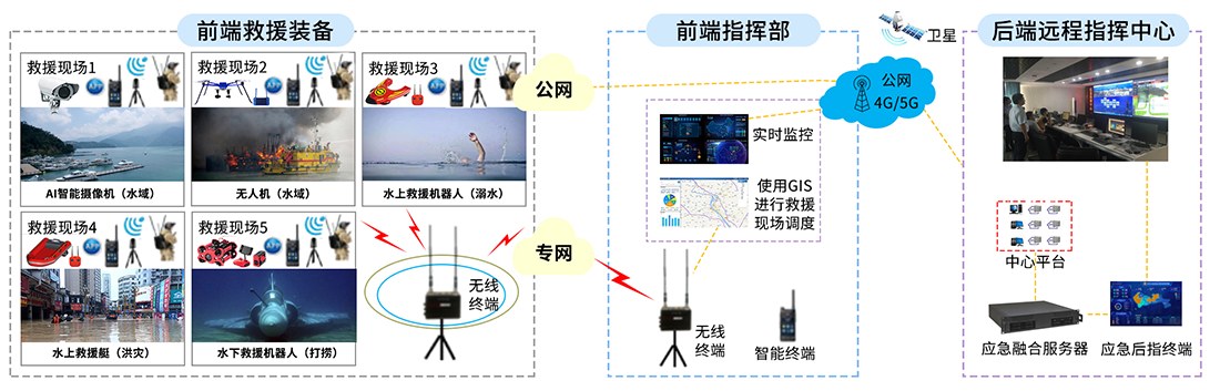 JTT水域救援系統是針對上述水域救援調度存在的問題,自主研發的一套集后端遠程指揮中心、前端指揮部及前端救援裝備于一體的水域救援系統,后端指揮中心應急指揮平臺分級管理及調度,前方救援現場數據的上傳并及時進行指令的下達,從而提高決策效率和救援效率。所有前端智能設備均與前端指揮部及后端指揮中心通過無線進行通信,前端遠程指揮中心根據其所接收的智能設備數據統一進行調度,指揮救援工作有序進行。