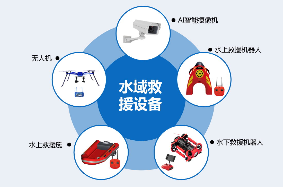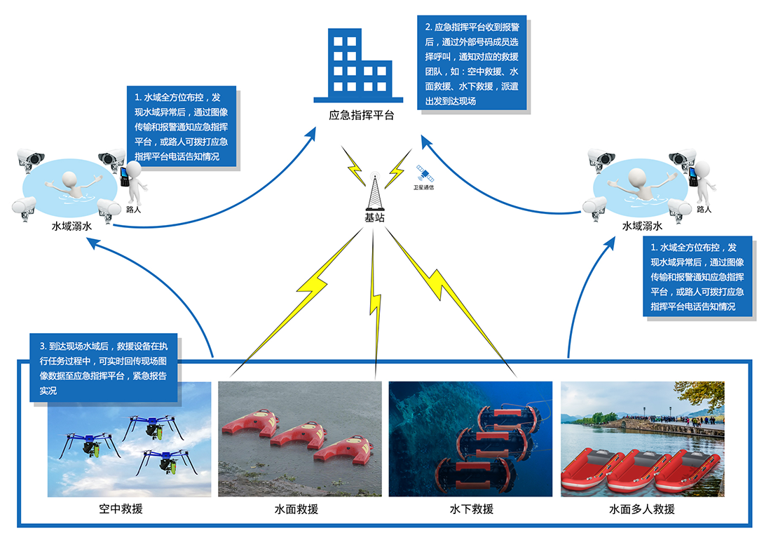 水域救援系統前端智能救援設備主要包括水域AI智能攝像機、空中救援無人機、水上救援機器人、水上救援艇、水下救援機器人等,組成從空中、水面、水下立體化救援系統,應對不同的救援場景需求,所有前端智能救援設備均與前端指揮部及后端指揮中心組成一體,聽命于應急管理平臺的統一調度,讓指揮救援工作有序、有效地進行。
