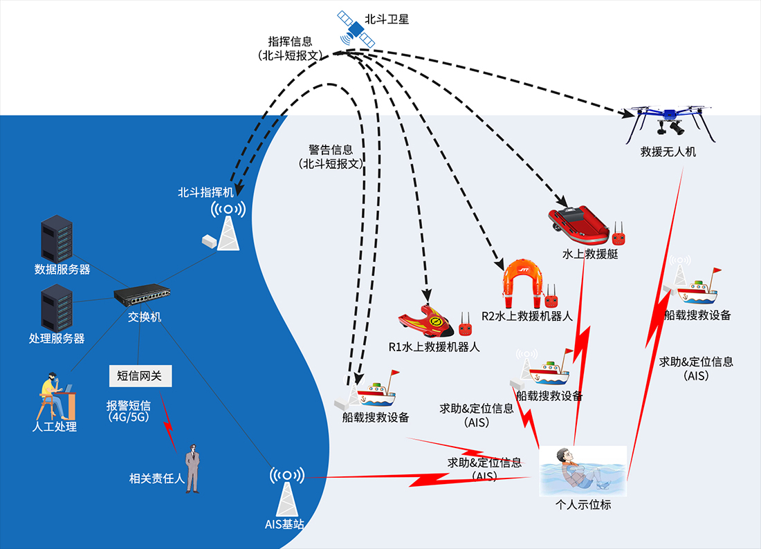 同時智能救援設備也可配備AIS船舶自動識別系統,應急指揮平臺與船舶識別系統互聯互通,對一些救援及搜救智能救援設備無法單體完成的情況下還可通過AIS船舶自動識別系統請求水域附近的船舶前往馳援。