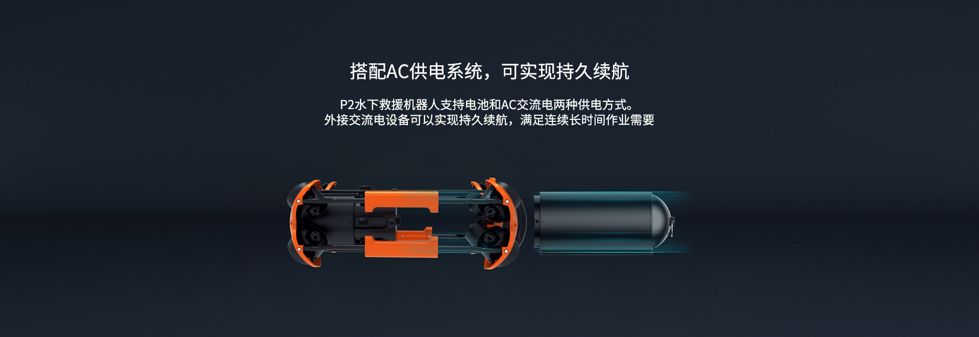 搭配AC供電系統(tǒng),可實現(xiàn)持久續(xù)航:P2水下救援機(jī)器人支持電池和AC交流電兩種供電方式。外接交流電設(shè)備可以實現(xiàn)持久續(xù)航,滿足連續(xù)長時間作業(yè)需要;