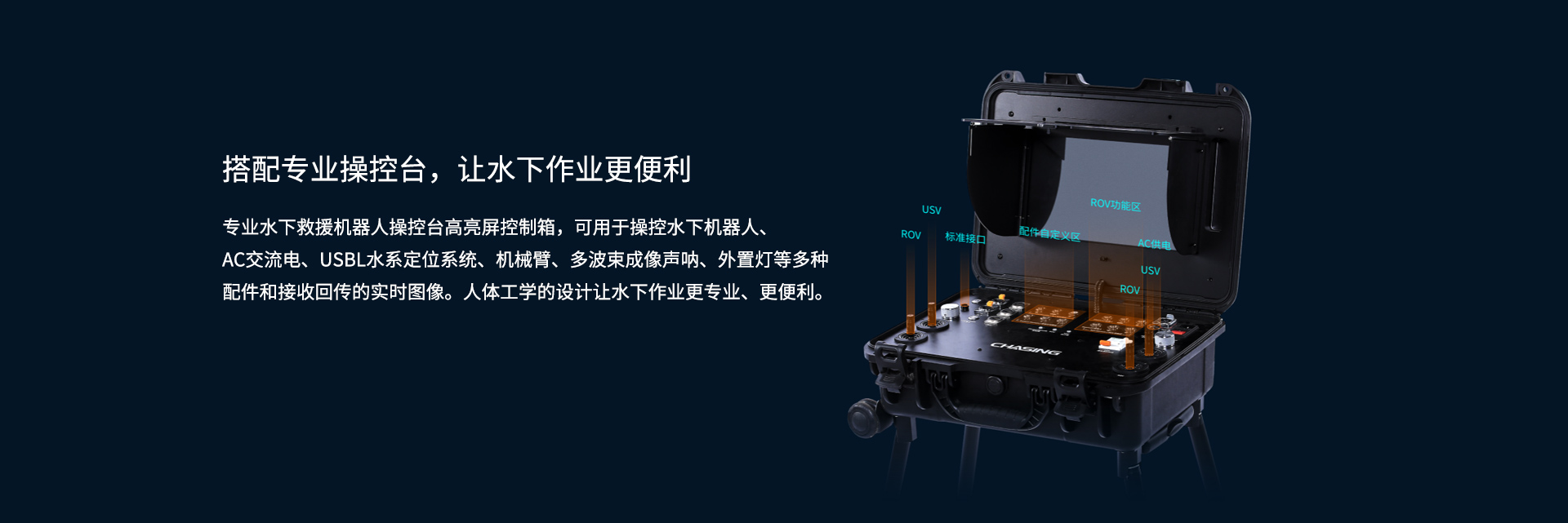 搭配專業(yè)操控臺,讓水下作業(yè)更便利:專業(yè)水下救援機(jī)器人操控臺高亮屏控制箱,可用于操控水下機(jī)器人、AC交流電、USBL水系定位系統(tǒng)、機(jī)械臂、多波束成像聲吶、外置燈等多種配件和接收回傳的實時圖像。人體工學(xué)的設(shè)計讓水下作業(yè)更專業(yè)、更便利。