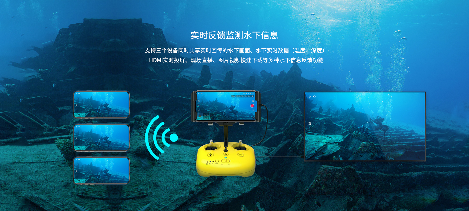 實時反饋監(jiān)測水下信息:支持三個設(shè)備同時共享實時回傳的水下畫面、水下實時數(shù)據(jù)(溫度、深度)HDMI實時投屏、現(xiàn)場直播、圖片視頻快速下載等多種水下信息反饋功能。