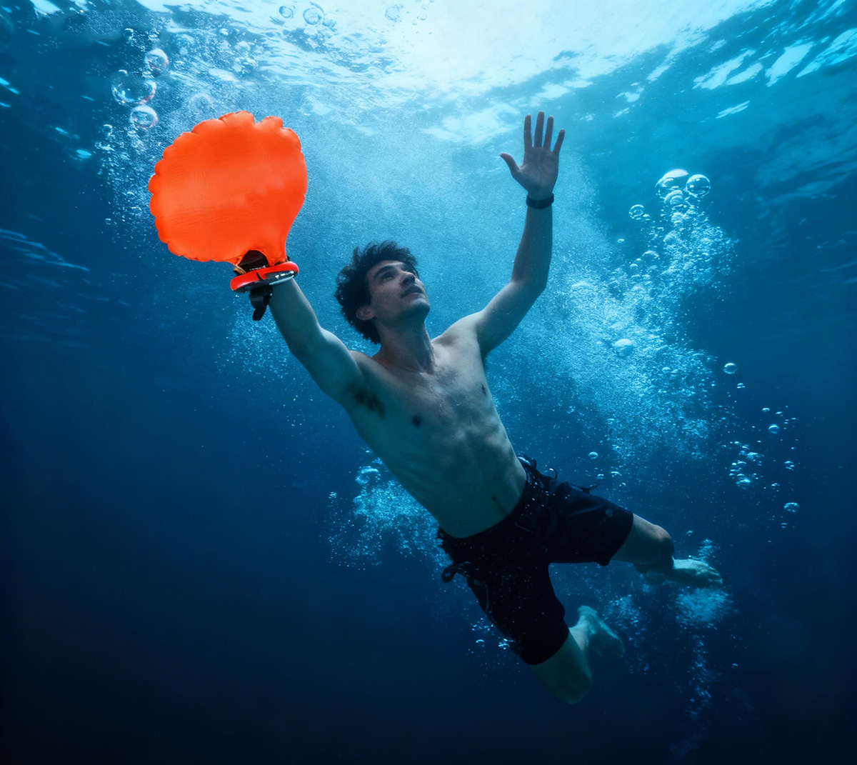 拉開控制桿,手腕盒中彈出氣囊迅速充氣膨脹,形成浮力裝置,協(xié)助漂浮在水面,表帶上配有指南針